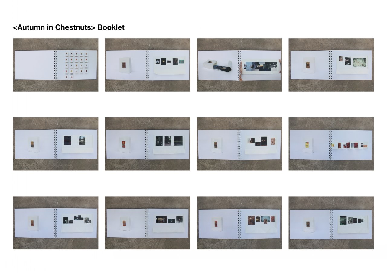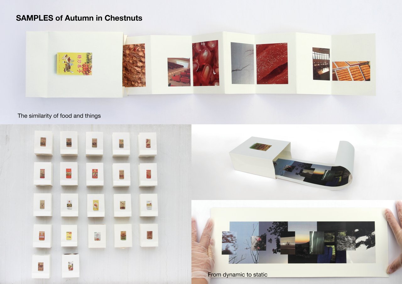 The project <Autumn in Chestnuts> is inspired by the specialness of chestnuts to me, it holds memories and longings for me, so I developed associations with autumn through its taste, in terms of memory, touch and nature. I chose the package of roasted chestnuts to demonstrate the association with autumn. For example, in the touch of wood, I used velvet and linen, to allow the viewer to touch the texture of the wood. Aided by the arrangement of images and mixed materials to create new feelings, it is presented as a book, inviting the audience into the autumn in my world. In <My Attachment Place>, I investigated theories of place attachment by reviewing childhood memories, focusing on the relationship between contact with caregivers and exploration of my surroundings to explain my place attachment. I experimented with the video format to narrate the connection between my upbringing and place through an interactive performance with spatial installation, collages and monologues. <The Poetic Boxes> installation starts from my crush experience and combines literary and visual expressions of personal emotions around profound feelings. I created five poems and used mixed media to create boxes that the audience can open on their own and discover the emotions hidden in the corners of these boxes.