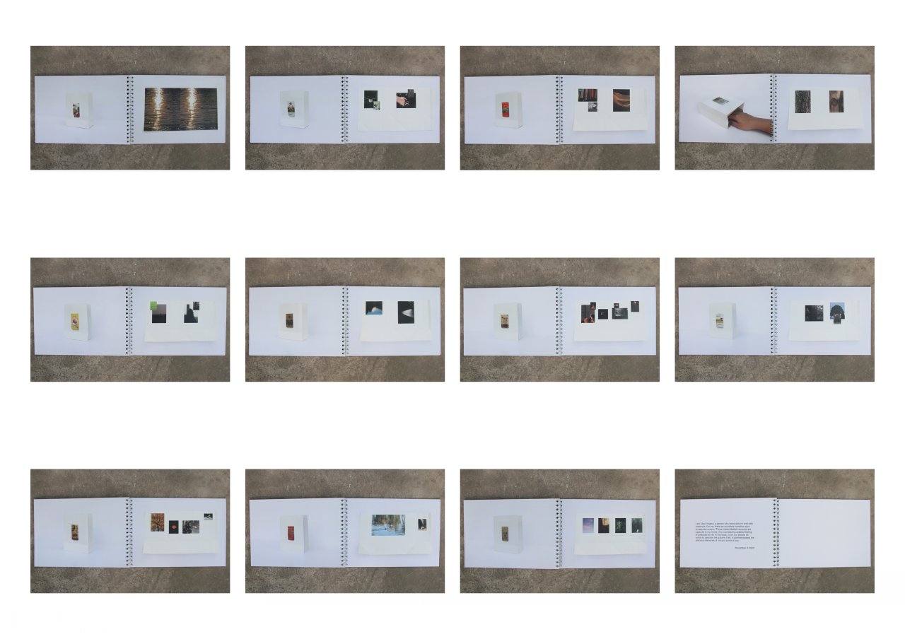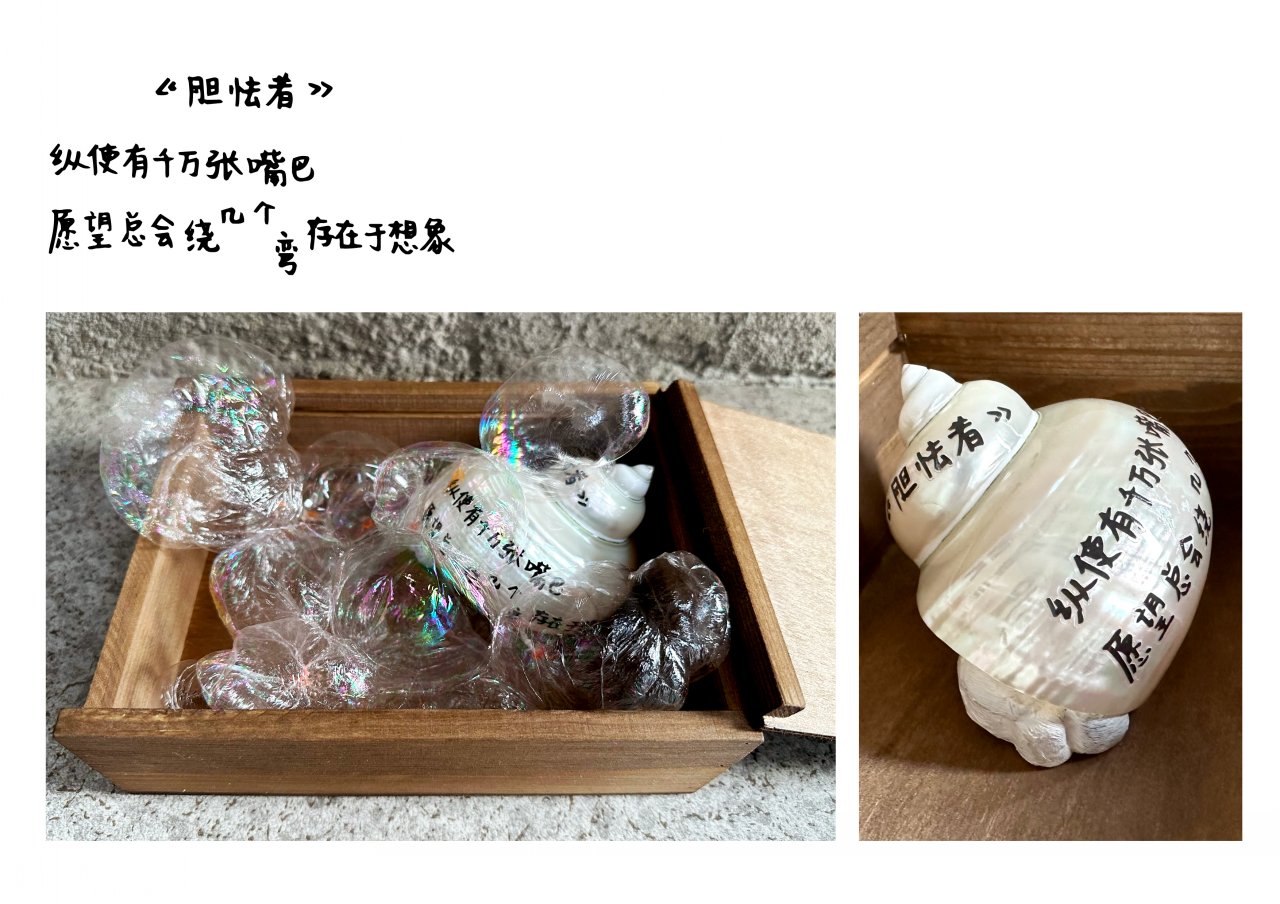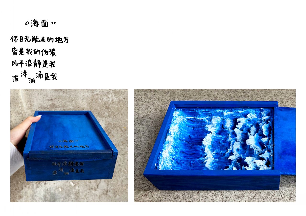 《栗的秋》靈感來(lái)源于栗子對(duì)我的特殊性,它對(duì)我來(lái)說(shuō)有著回憶和憧憬,所以我通過(guò)它的味道,從記憶、觸覺(jué)、自然等方面展開(kāi)對(duì)秋天的聯(lián)想。我選用了糖炒栗子的包裝袋并在每個(gè)袋子裝進(jìn)我的聯(lián)想。比如其中一個(gè)重點(diǎn)是秋天木頭的觸感,我用天鵝絨和亞麻面料,讓觀眾能夠觸摸到木頭的質(zhì)感。該作品采用圖片的排列方式及綜合材料輔佐來(lái)創(chuàng)造新的感覺(jué),最終以書的方式呈現(xiàn),邀請(qǐng)觀眾進(jìn)入我的世界的秋天。在《我的依戀所在》中,我從回顧童年記憶中研究地方依戀的理論,將重點(diǎn)放在與照顧者的接觸和對(duì)周圍環(huán)境的探索之間的關(guān)系來(lái)解釋我的地方依戀。我嘗試了視頻形式,通過(guò)與空間裝置的互動(dòng)表演,拼貼的畫面和獨(dú)白,敘述我的成長(zhǎng)和地方之間的聯(lián)系?!栋岛小费b置由我的暗戀經(jīng)歷出發(fā),圍繞深刻的感受,結(jié)合了文學(xué)和視覺(jué)表達(dá)個(gè)人情感。我創(chuàng)作了五首詩(shī),用綜合材料來(lái)制作盒子,讓觀眾自主打開(kāi)并發(fā)現(xiàn)藏在盒子各個(gè)角落的暗戀情愫。