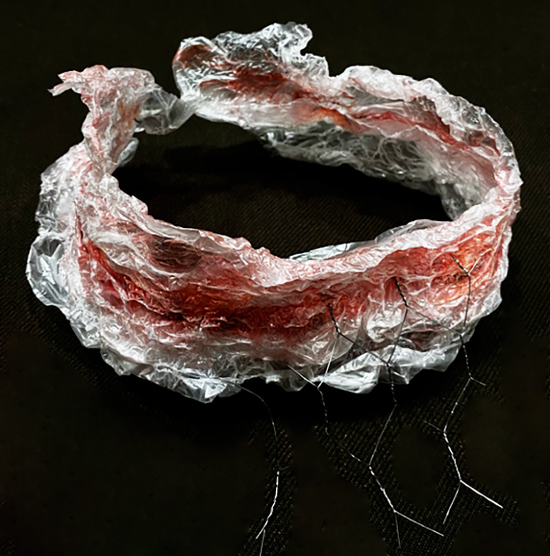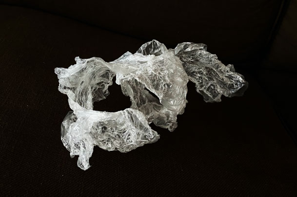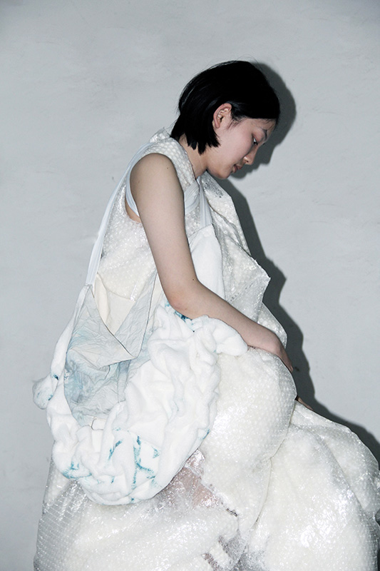 The work <Quirks> tells a story about the eccentricity forms unconsciously in Vicky's life. Based on observations, these quirks include childhood memories and unconscious preferences. Vicky Miao is eager to express herself through clothing, rather than speaking straightforwardly in language to the audiences. She uses variety making skills in this work which come from the story. For example, the idea of processing by the plastic packaging machine comes from the memory of sealing nougat packaging.